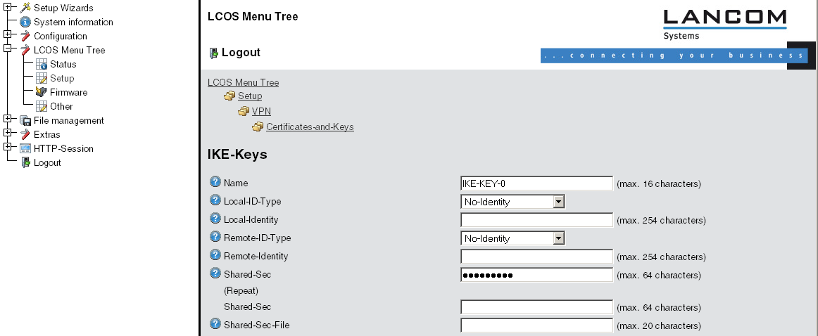 - Under Configuration / VPN / IKE-Param. / IKE key set a new IKE key for the connection: