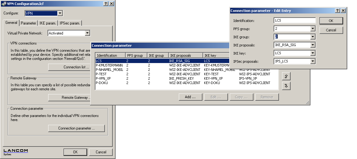 - Finally, the VPN connection parameters must be set up to use the correct IKE proposals ('IKE_RSA_SIG'). The values for 'PFS group' and 'IKE group' must agree with the values set in the IKE connection parameters. Configuration with LANconfig