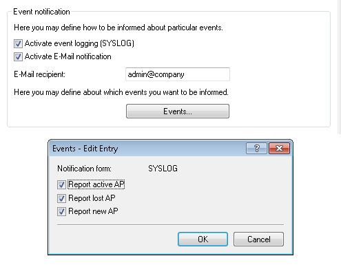 Notification can take place via SYSLOG or e-mail. You can define the following parameters:
