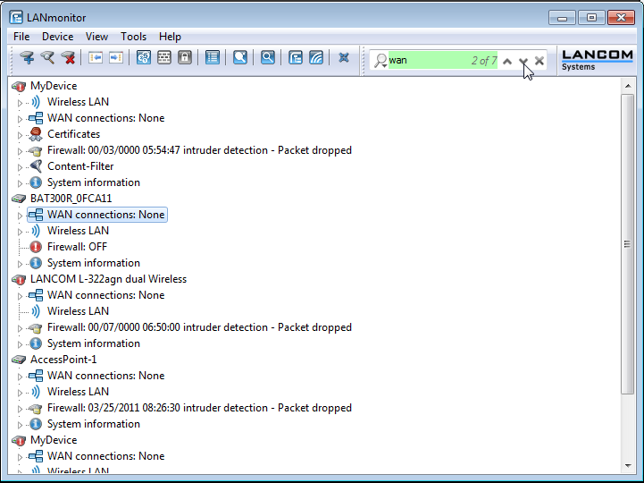 Depending on the application, LANmonitor can display multiple devices with entries containing the searched term. After starting the search LANmonitor initially highlights the first finding. You can move between the search results either by using the arrow keys to the right of the search window, or by pressing Ctrl+F3 for the next occurrence and Ctrl+Shift+F3 to the previous occurrence.
