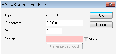 Secret: Password for the RADIUS service. The key (secret) must agree with the