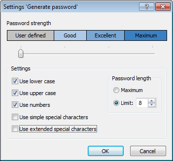 Use the slider to set the desired password strength. With the User defined setting, you can define the maximum password length and the required character types. The settings Good, Very goodand Maximum are predefined settings with reasonable, non-modifiable values.