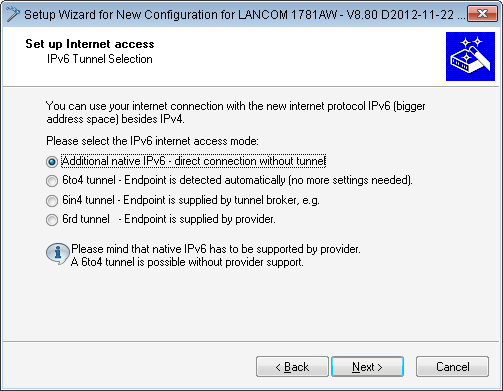 | Setting up IPv6 Internet access / IPv6 access using the Setup Wizard in LANconfig | |