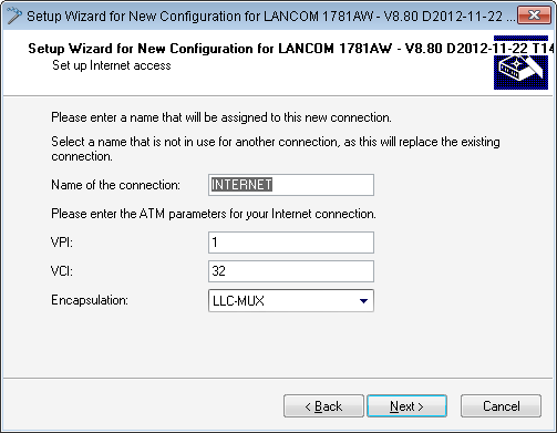 If you access the Internet with an alternative connection, e. g. over a PPPoE connection, you should additionally enter the appropriate ATM parameters.