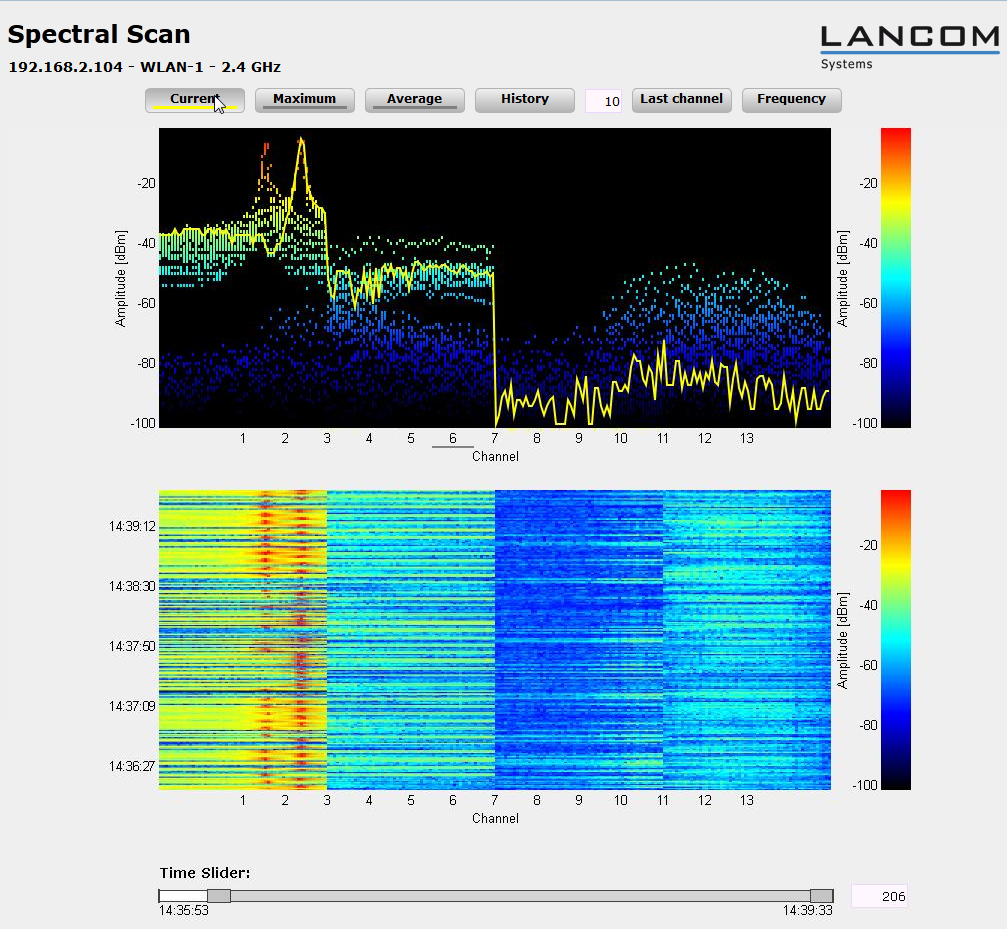 - Average: Shows or hides the average values of the ongoing spectrum scan in relation to the currently set history range.