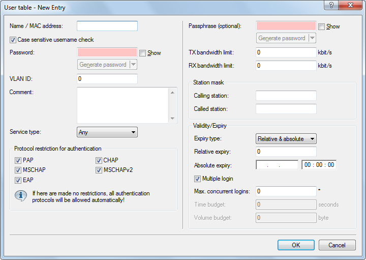 Note: Please note that, depending on the device, the number of entries can be limited with the service type Any or Login. If your device, for example, is able to manage a total of 64 Public Spot users, the LANconfig rejects them after 64. User account with the service type Any/Login requires the creation of additional user accounts with these service types. - Protocol restriction: This option limits the selection of authentication methods allowed for the user. Possible values include: