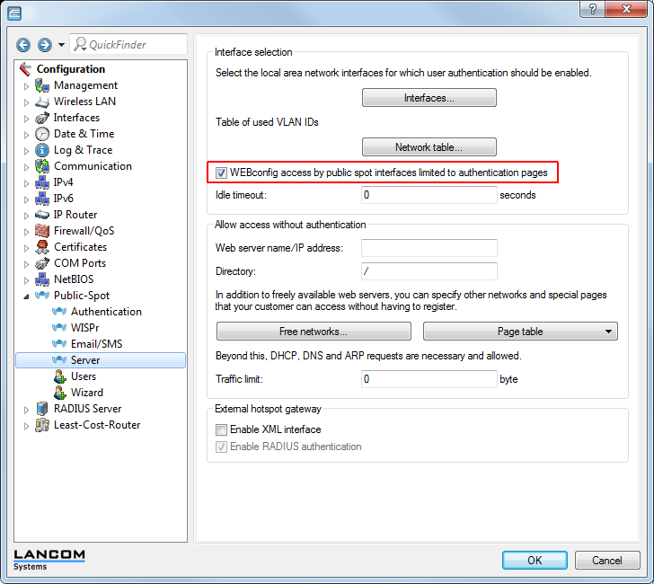 Public Spot access to a Public Spot network's configuration (WEBconfig) should always be prohibited for security reasons. A special switch allows access via the Public Spot interface to be restricted to the Public Spot authentication pages only. All other configuration protocols are automatically blocked.
