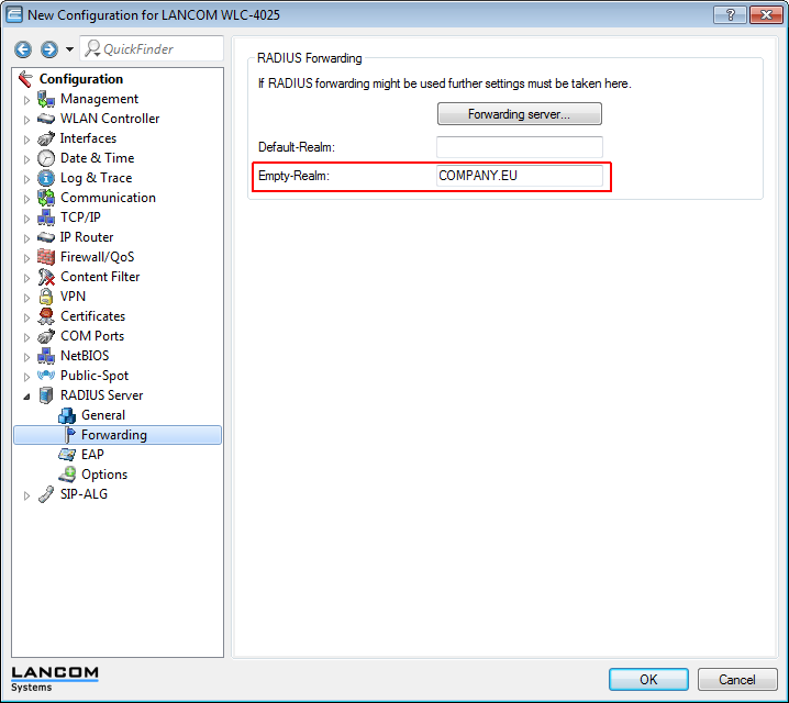 In the WLAN controller's RADIUS server, define an "empty realm" (e.g., "COMPANY.EU").