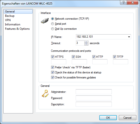 - Description: Enter the description of the device that you want LANconfig to display in the main window.LANconfig stores the credentials persistently, so that you no longer need to enter them when re-accessing the device.