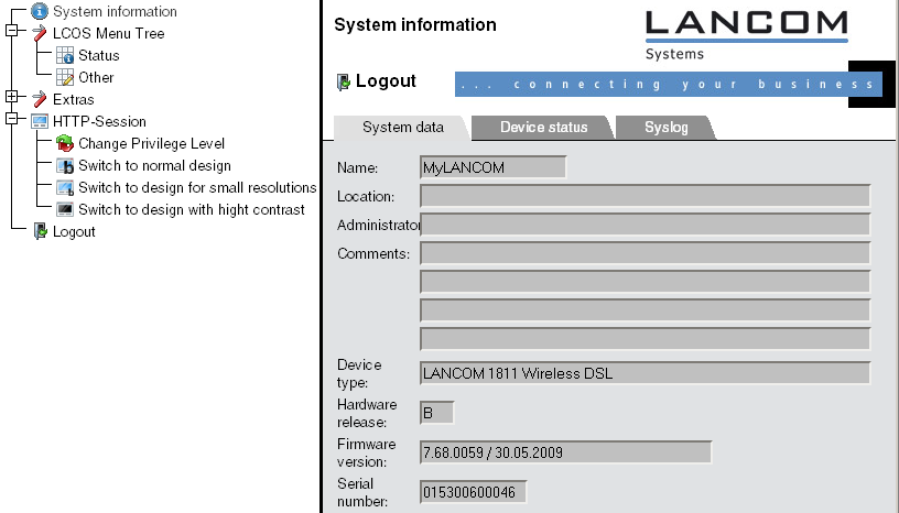 The corresponding password is requested in the following dialog. After logging in, the user initially sees a reduced WEBconfig user interface. If authorization is not being used, all WEBconfig users (except for the user "root") initially have read rights only.