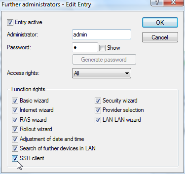 Rights to work with the SSH client can be allocated on an individual basis to each administrator of LANCOM devices.