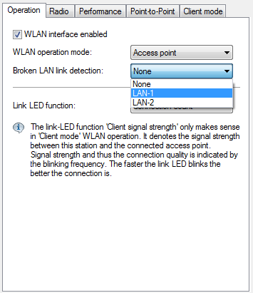 Note: The interface descriptors LAN-1 to LAN-n stand for the logical LAN interfaces. To make use of this function, the physical Ethernet ports on the device must be set with the corresponding values LAN-1 to LAN-n.Note: Broken-link detection can also be used for WLAN devices operating in WLAN client mode. With broken-link detection activated, the WLAN modules of a WLAN client are only activated when a connection exists between the relevant LAN interfaces and the cabled LAN.