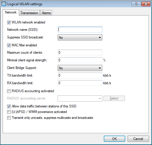 - RX bandwidth limitWith this setting, you define the overall bandwidth that is available in the reception direction within this SSID (limit in kbps). A value of 0 disables the limit.