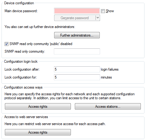 In order to enable authentication for SNMP read access, you must deactivate the community 'public'. You can do this by enabling the option SNMP read-only community 'public' disabled. This setting only allows information about the state of the device, current connections, reports, etc., to be read out via SNMP after the user authenticates at the device. Authorization can be conducted either with the administrator-account access credentials or an access account created for the custom SNMP community.