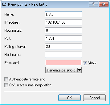 In the following example, the device operating as a L2TP access concentrator (LAC) establishes an L2TP tunnel to an L2TP network server (LNS) with the IP address 192.168.1.66.