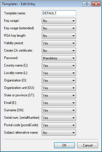 Tip: If the Templates table is empty, the user can only see the input fields for the profile name, the common name (CN), and the password. The other profile fields retain the default values as set by the device administrator.