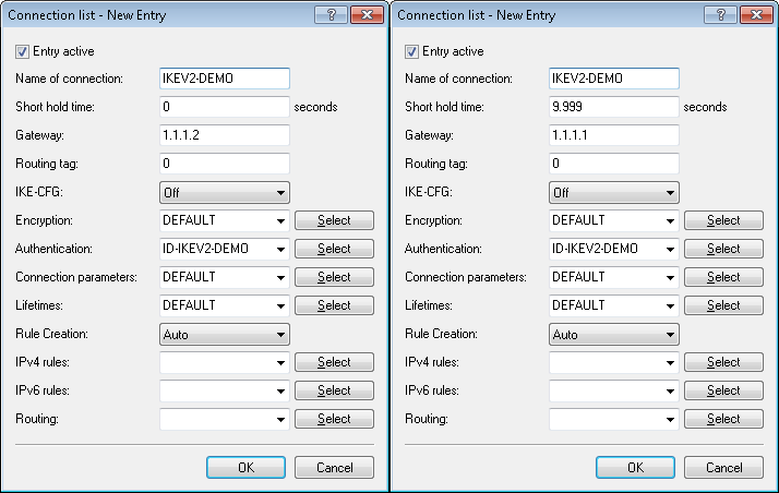 | Name | Enter the name for the authentication here. In this example, ID-IKEV2-DEMO was entered on both devices. This entry is used later in the VPN connection list. |