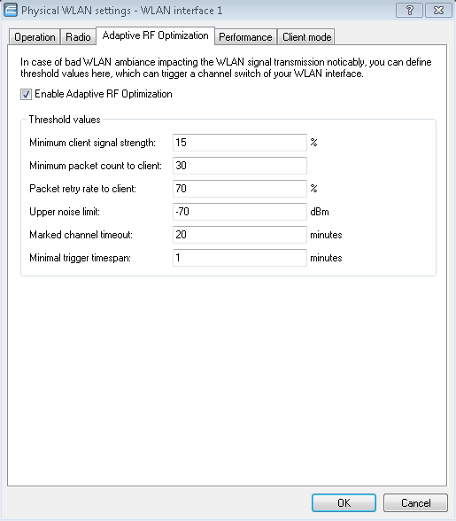 - To enable monitoring of the WLAN radio field via Adaptive RF Optimization, check the box Enable Adaptive RF Optimization.