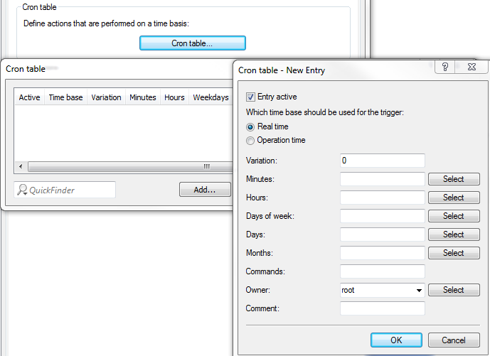 - Select operation time as the time base for the cron job.Important: If you select operation time, the only fields in the cron table that are evaluated are the hours and minutes.