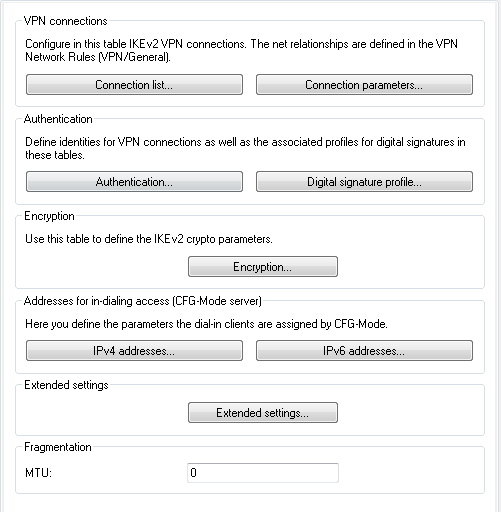 In order to configure an IKEv2 connection, you first need to make an entry in the Connection list. LCOS contains default entries in order to minimize the effort of configuration. Most of these entries contain default parameters with common settings for strong encryption algorithms, dead-peer-detection, and lifetimes. All you need to do is specify the address of the VPN remote peer, the authentication parameters (under Authentication), and the VPN rules (under ).