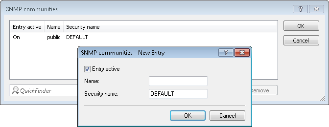 For SNMPv1 or SNMPv2c, you force the entry of login data for SNMP read-only access by disabling the public community in the list of the SNMP communities. This setting only allows information about the state of the device, current connections, reports, etc., to be read out via SNMP after the user authenticates at the device. Authorization can be conducted either with the administrator-account access credentials or an access account created for the individual SNMP community.