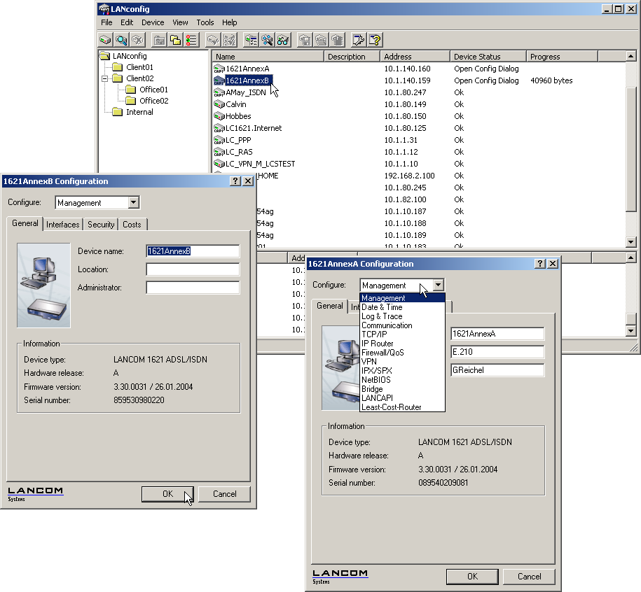 The management of larger projects can be aided by simultaneously opening up configuration windows for multiple devices to compare similarities and differences. LANconfig allows multiple configuration dialogs to be opened at the same time ("multithreading"). After opening the configuration for a device, simply open up further configurations from the device list in LANconfig. All of the configurations can be processed in parallel.