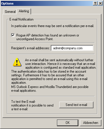 Note: In order to send e-mail alerts, the computer on which WLANmonitor is running requires a standard e-mail client (MS Outlook Express or Mozilla Thunderbird) that allows automatic mail transmission to be configured and running.