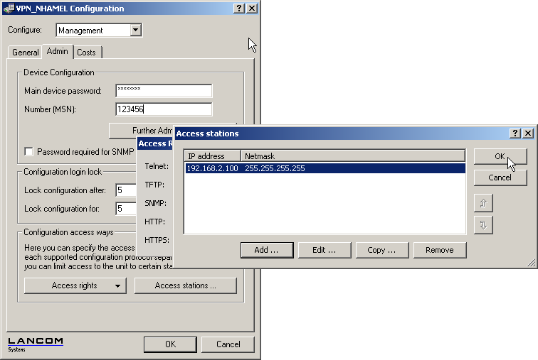 Note: As long as no MSN is entered for the configuration access, a non-configured LANCOM accepts the calls on all MSNs. As soon as the first change is saved in the configuration, the device only takes calls on the configured MSN! If no MSN configuration is entered the remote access is switched off and the device is protected against access over ISDN.