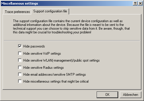 When saving the device configuration, security-related information of no relevance to support can be hidden. Use Extras / Other settings / Support file in the trace window to select which information is not to be saved in the support file: