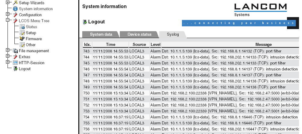 The SYSLOG protocol is used to log the activities of a LANCOM device. This function is especially interesting for system administrators as it records a a complete history of all activities in the device. The information captured in the SYSLOG log can be viewed in different ways: