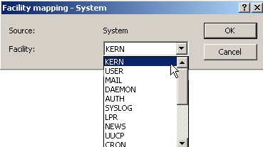 The standard mapping can be changed, if necessary. So, for   example, all SYSLOG messages from a LANCOM can be sent with a certain facility (Local7). It is thus possible to collect all LANCOM messages in a common log file by configuring the SYSLOG client appropriately.