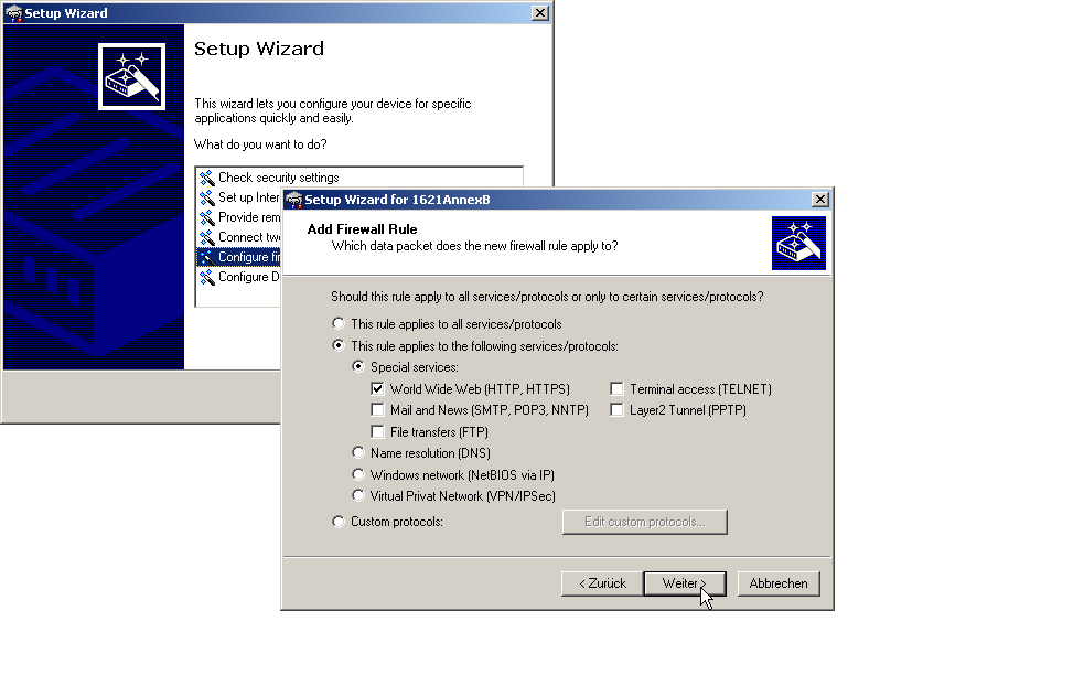 The fastest method to configure the Firewall is provided by the Firewall wizard in LANconfig: