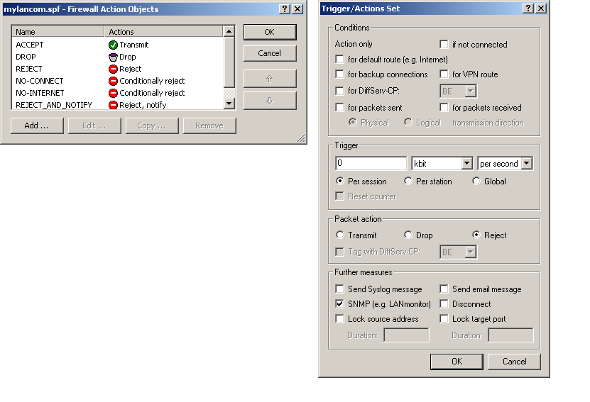 Here you specify here the firewall action, which is comprised of condition, limit, packet action and other measures to be used by the firewall rules.