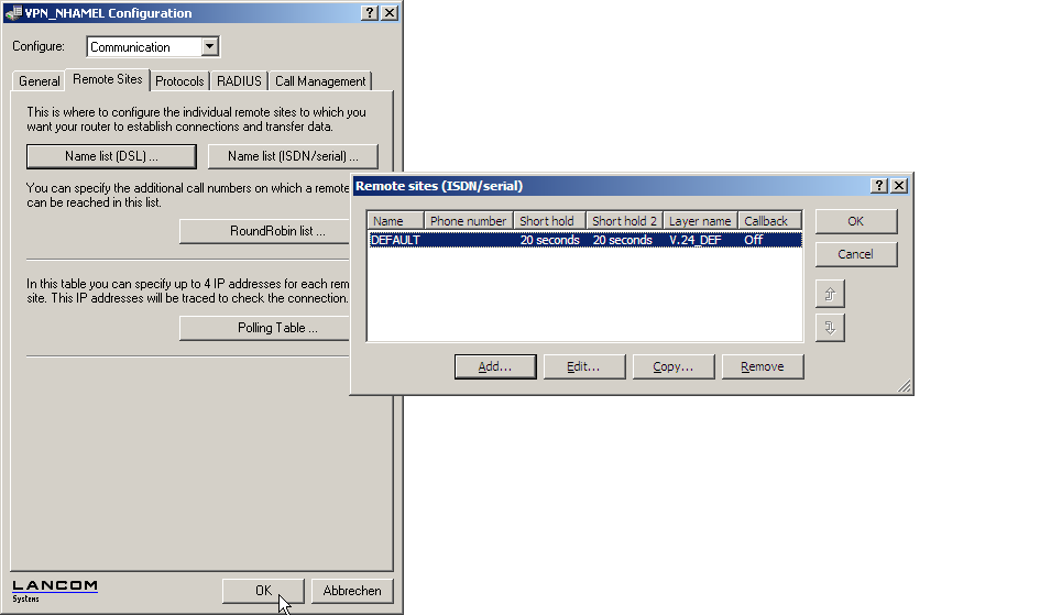 LANconfig: Communication / Remote sites / Remote sites (ISDN/serial)