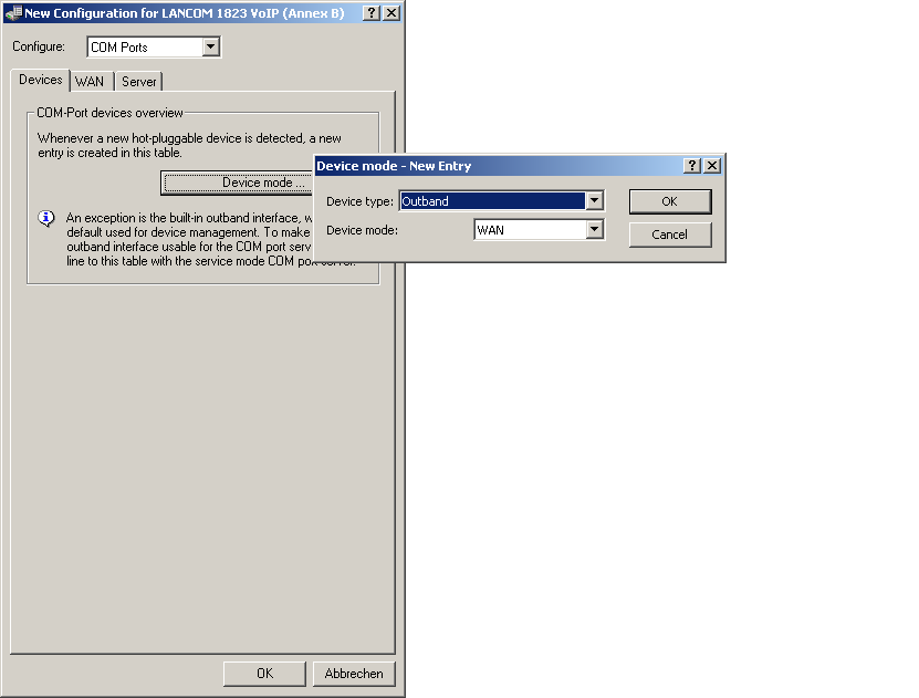 The serial interfaces in the LANCOM can be used for various applications, for example for the COM port server or as a WAN interface. The Devices table allows individual serial devices to be assigned to certain applications. As soon as a HotPlug-capable USB adapter is detected, a new entry for the serial interface provided by this USB adapter is created automatically in this table. This automation simplifies the configuration of the serial devices. An exception is the built-in serial interface, which is used for configuration purposes as standard. Entries can be added to the Devices table manually to use this interface for the COM port server or WAN applications.