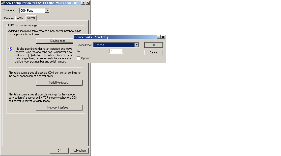 This table activates the COM port server at a port of a certain serial interface. Add an entry to this table to start a new instance of the COM port server. Delete an entry to stop the corresponding server instance. The switch Operating can be used to deactivate a server instance in the table.