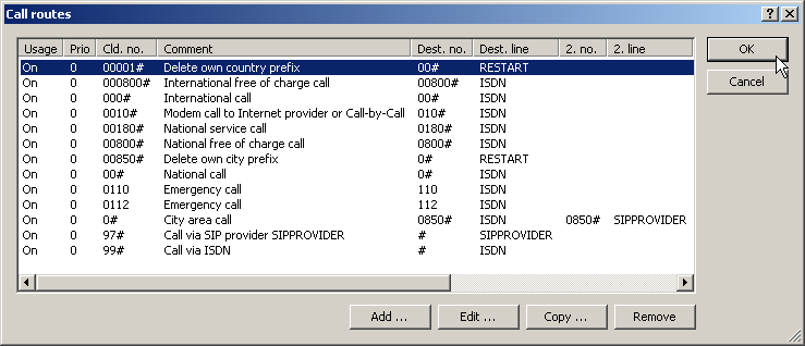 This suggested call routing table would place all external calls over the ISDN line. The SIP line is set up as a backup for international and national long distance calls and local calls that are not in the list of special or emergency numbers.