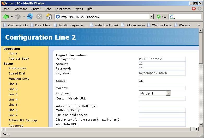 - From the Setup menu, select one of the possible lines, e.g. 'Line 2'.