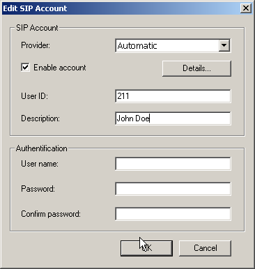 - Enter the SIP-account user name and password for logging in to the SIP PBX.