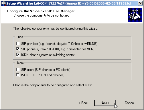 - Under LANconfig, start the setup wizard for configuring the VoIP Call Manager. Enable the options 'SIP phone system', 'ISDN phone system' and 'ISDN users'.