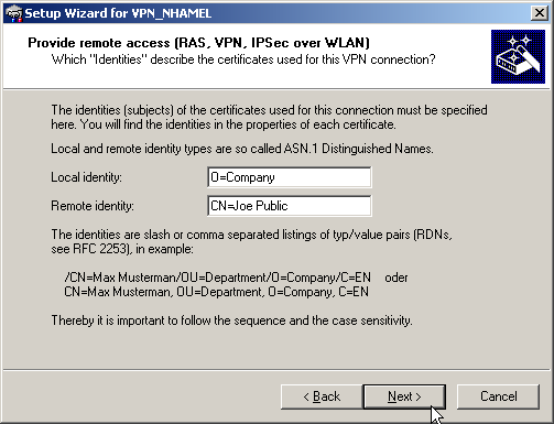 - Enter the identities contained in the certificates for the local and remote devices. Be sure to use the information from each certificate in full and in the right order: The ASN.1-Distinguished Names listed in Windows from top to bottom in the certificates must be entered into LANconfig from left to right.