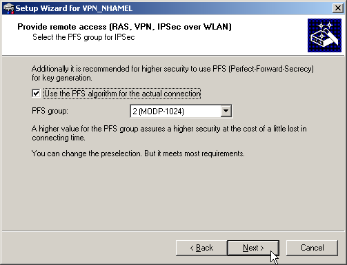 - If available choose the optimized connection establishment with IKE and PFS group 2. Only choose group 5 as the PFS group if this is required by the client.