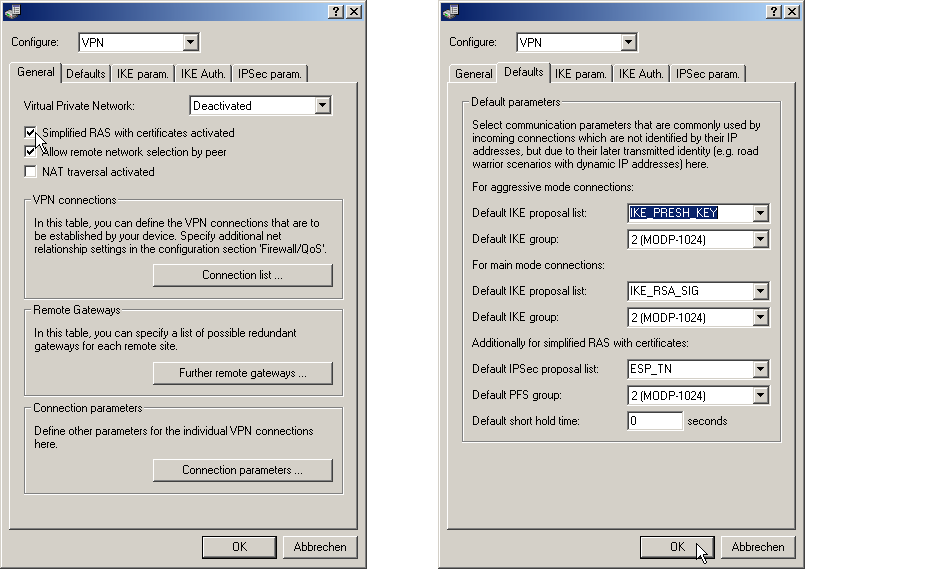 If simplified dial-in with certificates is activated for the LANCOM Router at the headquarters, then the remote routers can suggest a network to be used for the connection during the IKE negotiation in phase 2 This network is entered, for example, when setting up the VPN connection on the remote router. The LANCOM Router at the headquarters accepts the suggested network when the option 'Allow remote station to select the remote network' is activated. Moreover, the parameters used by the client during dial in must agree with the default values in the VPN router.