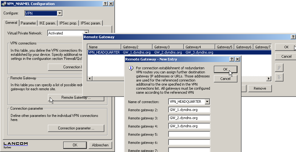 Note: The entry for the gateway in the VPN connection list can be left blank if all of the possible gateways are entered into the list of "Remote gateways".