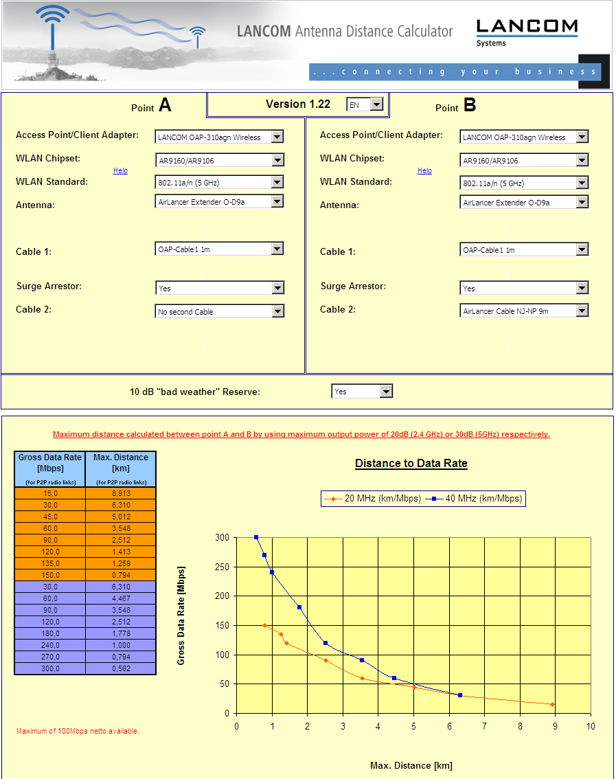 After selecting your components (access points, antennas, lightning protection and cable) the calculator works out the data rates, ranges, and the antenna gain settings that have to be entered into the access point.