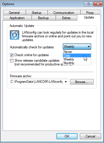 - When carrying out the automatic search for updates, LANconfig searches this location for new versions of the LCMS and the firmware.