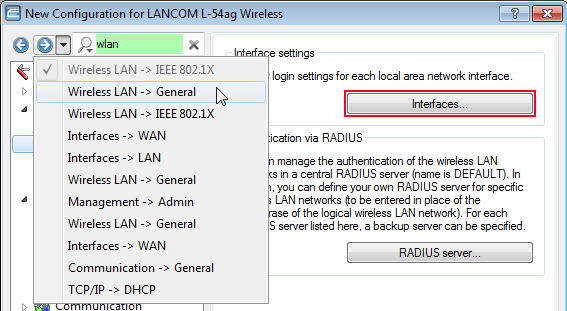 Select an area in the configuration (e.g. 'WLAN/General') to view the relevant search results framed in color in the configuration dialog: