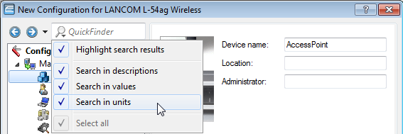 If you are looking for a particular value or term in LANconfig or in the configuration, LANCOM QuickFinder quickly displays all of the locations where the string occurs in the LANconfig dialogs.