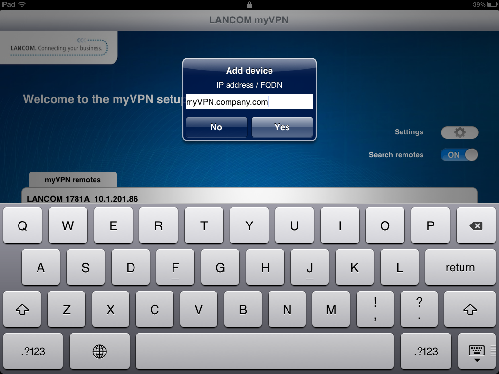Optional: Select the option Add device manually to enter the IP address or name of VPN devices that the iOS device can access via an Internet connection (3G or WLAN). In the dialog that follows, enter the IP address or the name of the VPN device and confirm with Yes.