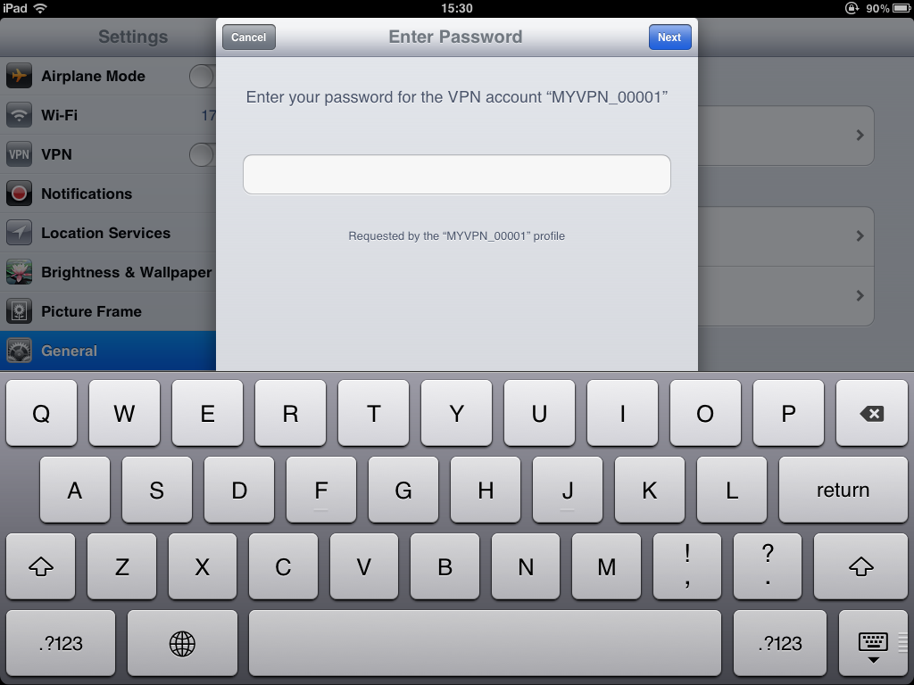 Note: By disabling the myVPN profile, other IOS device are prevented from installing the same myVPN profile and thus using the same VPN access credentials. However, disabling the myVPN profile has no effect on the VPN connection itself.